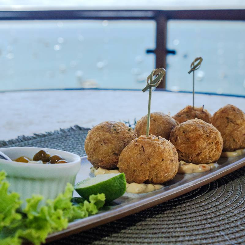 Dadinho de tapioca com camarão, cream cheese e géleia de abacaxi.
